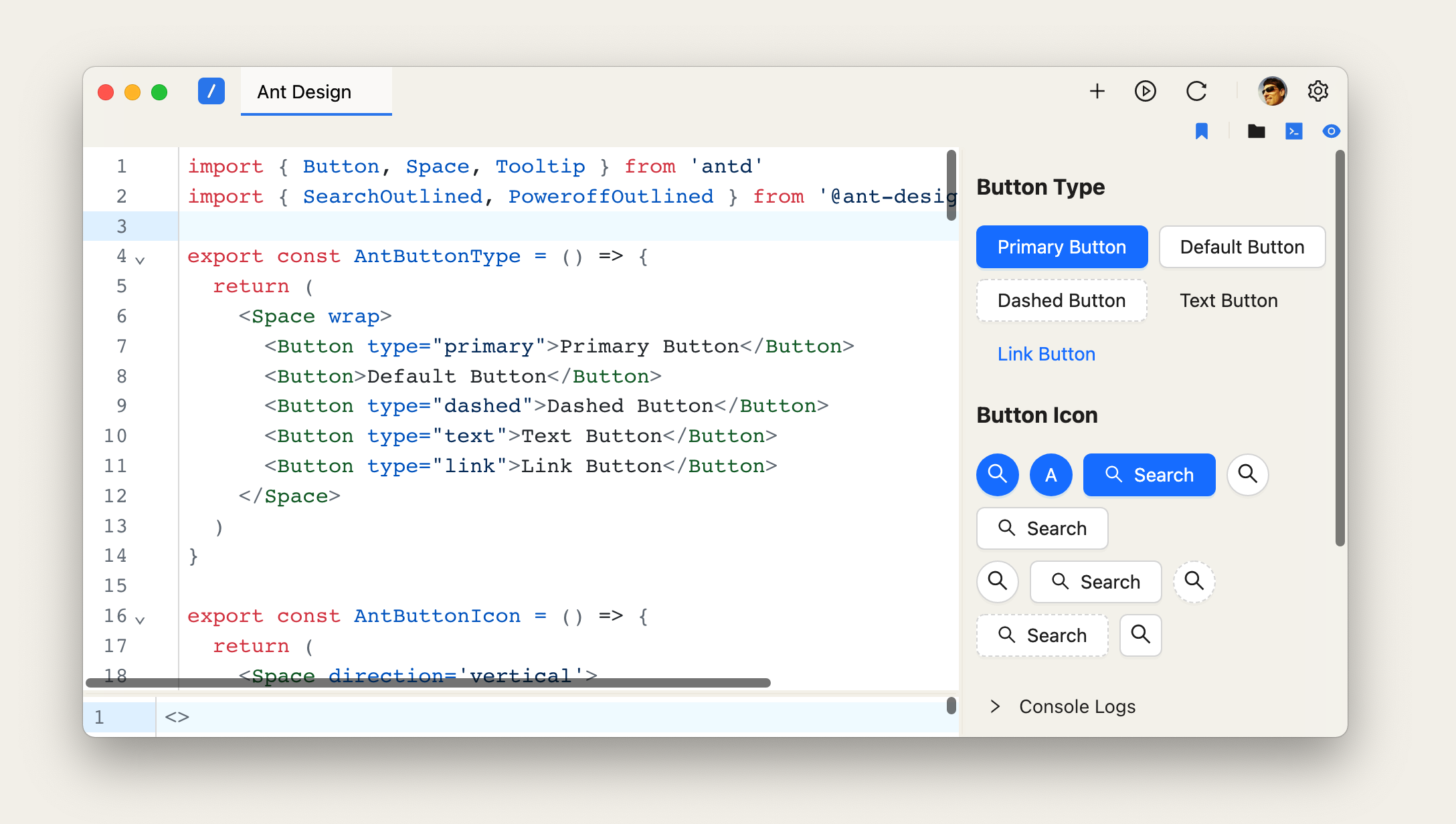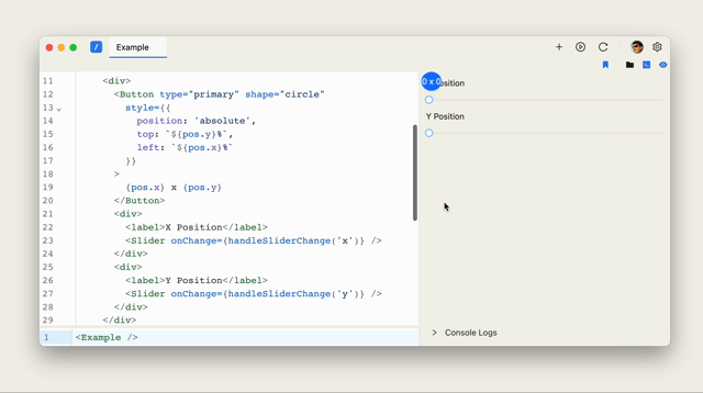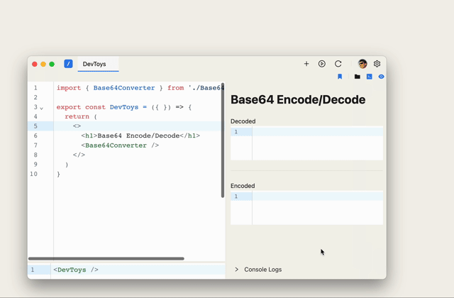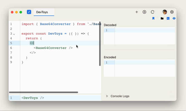 Use the familiar React syntax to write your code. Djot will automatically compile it to Javascript and run it for you instantly.